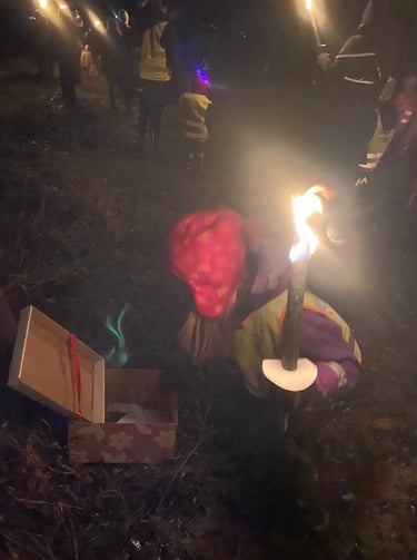 Det snöade rejält när 17 barn och nästan lika många vuxna genomförde 2024 års tomtevandring. Tomten väntade i skogsbrynet och var säkert förväntansfull över vad han skulle hitta i sin brevlåda efter att barnen lämnat sina önskelistor där. Saft och pepparkakor gav lite extra energi till promenaden och facklor lyste upp i snöyran och mörkret.