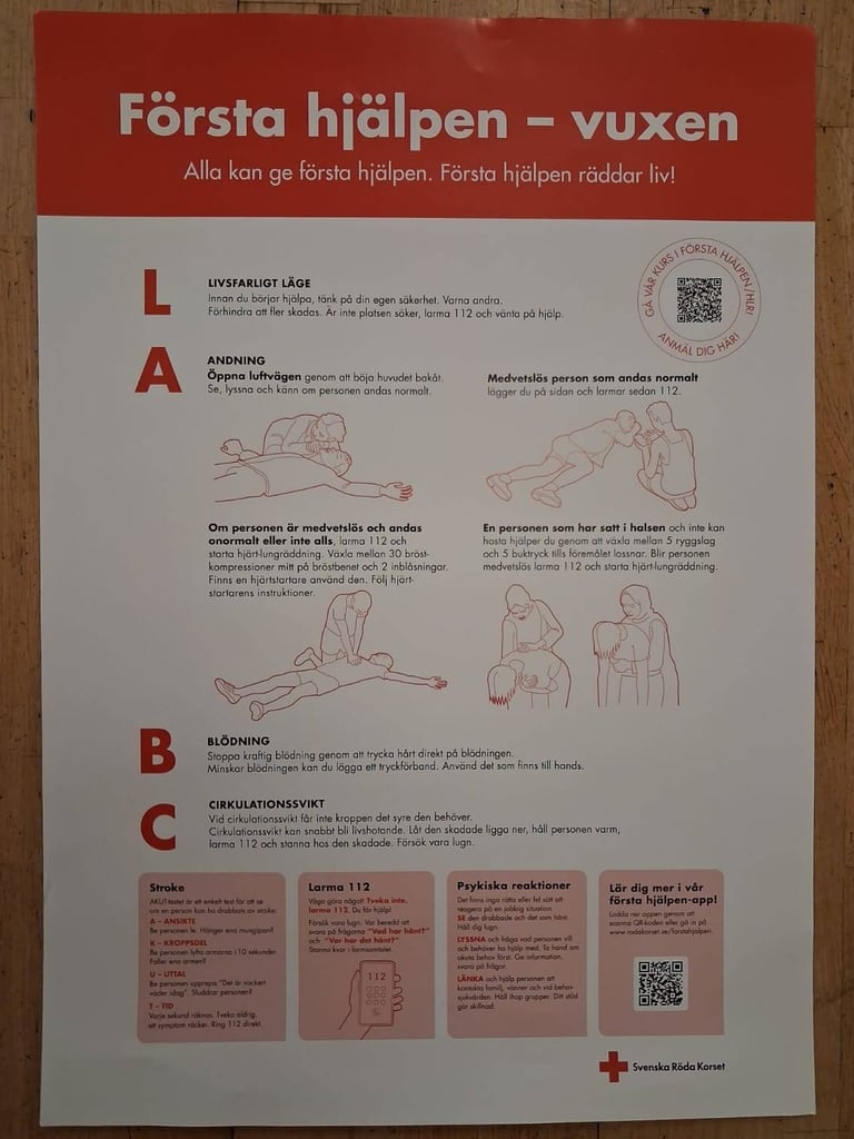 Som ett led i bygdegårdens satsning på att stärka beredskapen i byn så bjöd vi in Röda Korset för att lära oss första hjälpen. Utbildningen blandade på ett jättebra sätt både teori och praktik. Vi fick öva både på dockor och på varandra. Röda Korsets utbildare var kunnig, pedagogisk och en alldeles utmärkt instruktör. Kunskapen om första hjälpen sattes också in i olika typer av olyckshändelser som man behöver tänka på och beakta. Lite fruktstund och kaffe hann vi också med. Det kändes som att syftet, att vi skulle känna oss tryggare i att agera ifall olyckan är framme, uppnåddes. Så alla gick nog hem denna söndag- eftermiddag i november och kände sig nöjda med att ha deltagit. Affischen till höger sitter nu uppe i bygdegårdens stolsförråd.